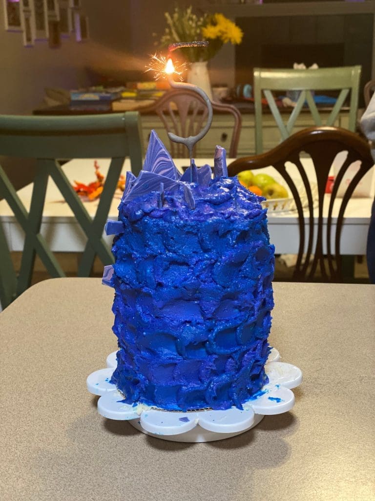 I made 3 9 inch cake rounds because that is what the recipe called for, but I used a large mason lid jar to cut out smaller cake rounds to make a smaller and taller cake. I used the white buttercream to do a crumb coat, so I didn’t have to worry about the scales getting mixed up with the cake. After it hardened in the cold Minnesota garage, I dyed the rest of the buttercream purple and blue, Josiah’s favorite colors. I put a little of each color in the frosting bag to create a sort of marbled or tye-dye look. I used an offset spatula to spread my dots out to get a scale-ey look. Since my cake was so small, I was able to snag this cookie decorating turntable. To create the spikes, I melted some Meltables, purple and blue, spread them out on parchment paper, used a toothpick to marble it, and let it sit in the garage to harden. Once it was set, we broke it up into pieces and stuck them in the cake.