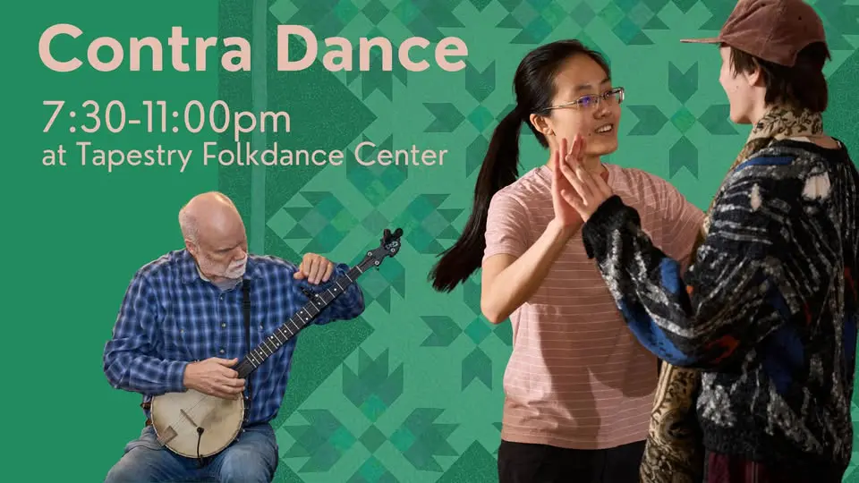 These dances are lively, social, easy to learn, and aerobic. Although you will dance with a partner, it isn’t necessary to come with one. All dances are taught and are usually done in “long-ways sets” (partners facing in long lines down the hall). Many of the regular Tapestry Folkdance Center Contra bands play old-time music (similar to bluegrass), but the music at any given Saturday night Contra may reflect a range of music traditions, such as New England, French Canadian, Irish, Scottish, Cape Breton and modern compositions.