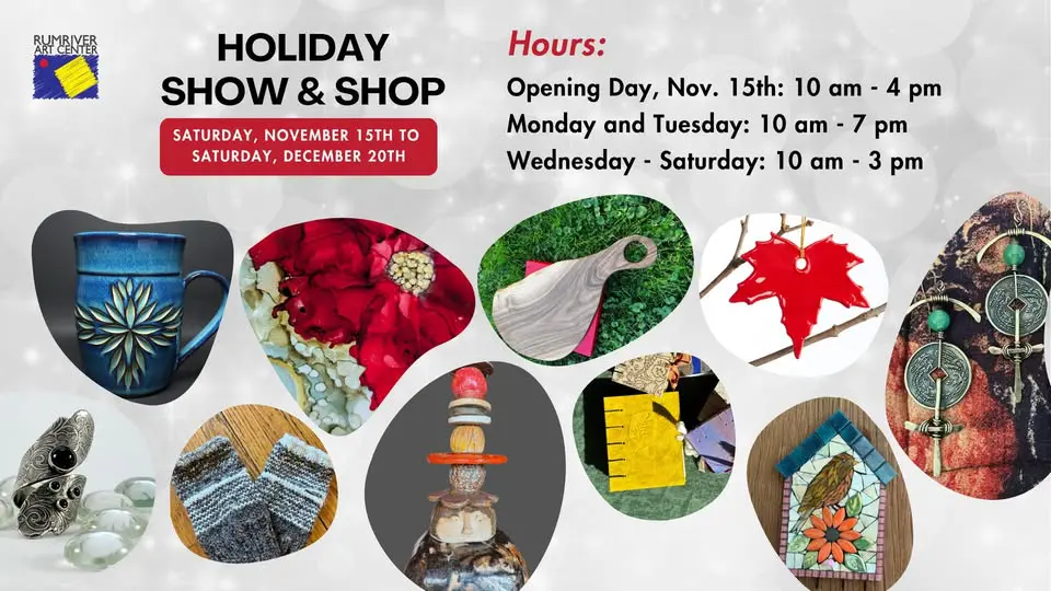 Rumriver Art Center is excited to announce our annual ‘Holiday Show and Shop’! This is the perfect opportunity to find one-of-a-kind holiday gifts created by local artists!