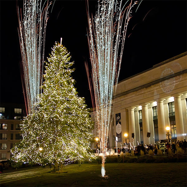 At 7:00 PM guests will move outside to the North Plaza for the tree lighting celebration followed by a short but thrilling fireworks display and Holiday sing-a-long.