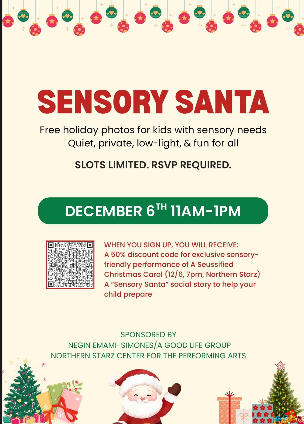 (P.S. When you sign up, you will receive a 50% discount code for exclusive sensory-friendly performance of A Seussified Christmas Carol at Northern Starz (12/7 @7pm), plus a “Sensory Santa” social story to help your child prepare for the photo event.)