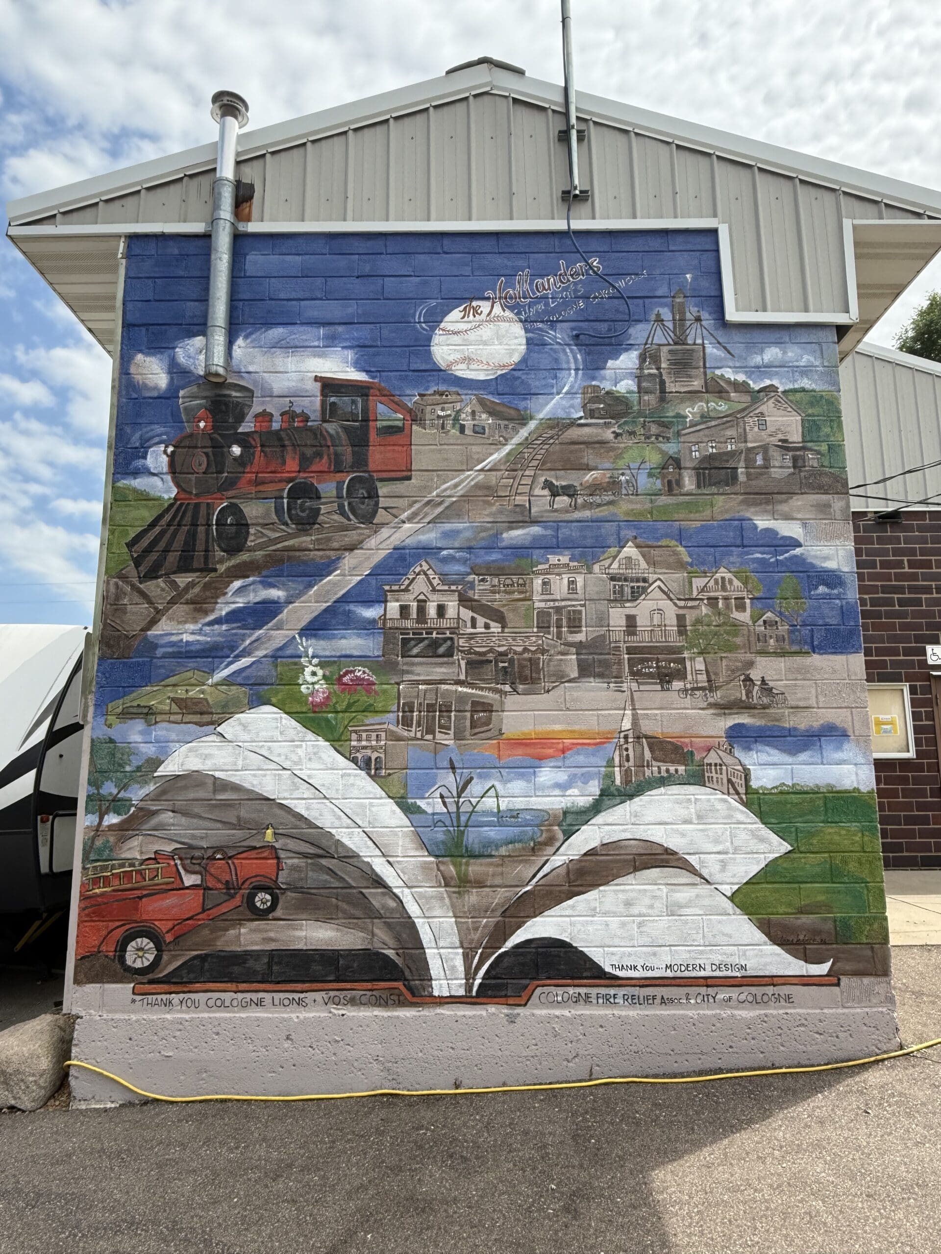 In nearby Cologne, a newly unveiled mural in City Square Park adds a splash of color and creativity to the town center. Painted on the west wall of the historic fire barn near the splash pad, the mural showcases scenes from the town’s early days and celebrates local heritage with vivid detail. It’s a beautiful backdrop for a quick photo or a leisurely walk through this charming community space.