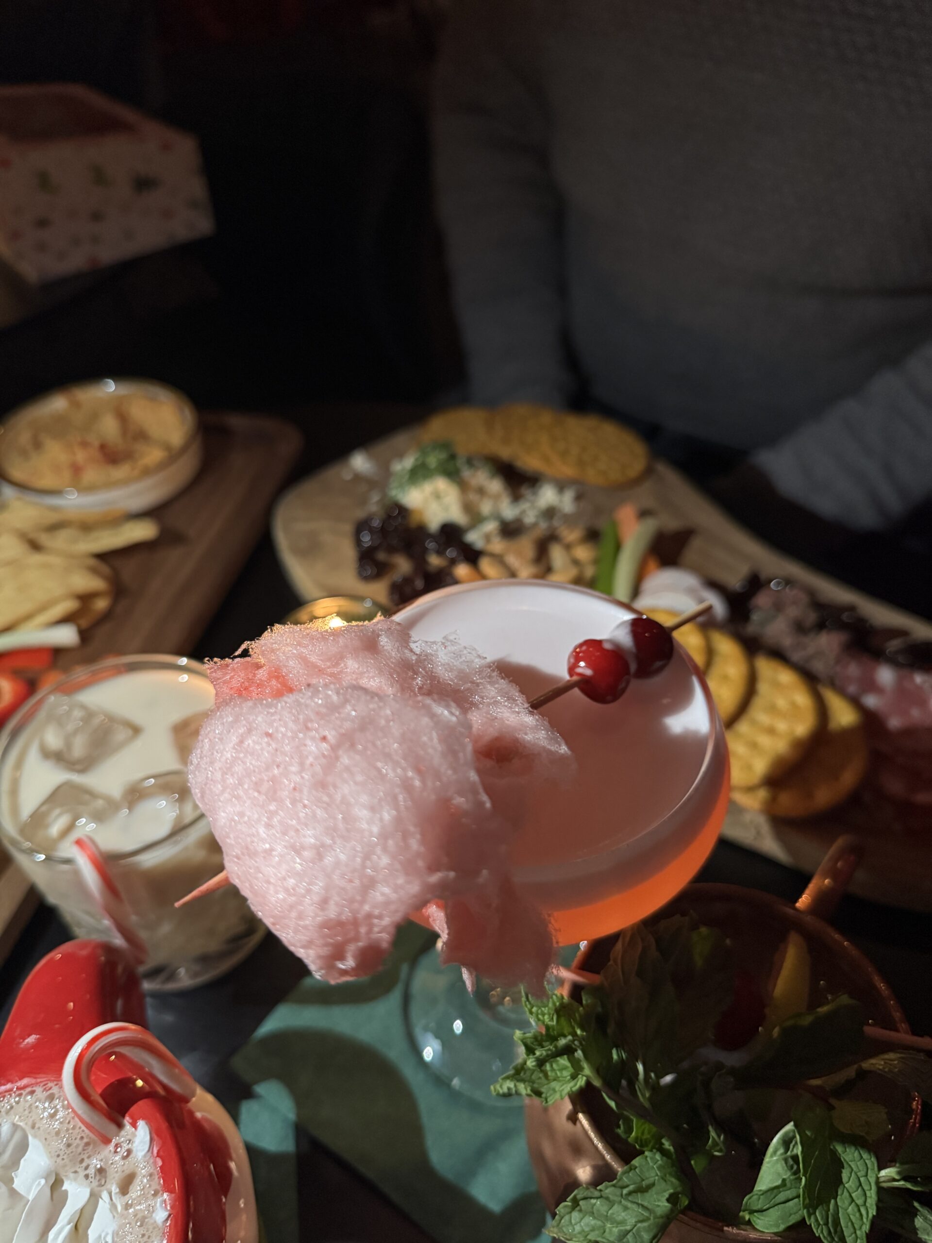 A charming holiday setup with festive drinks, cozy energy, and plenty of cheer.