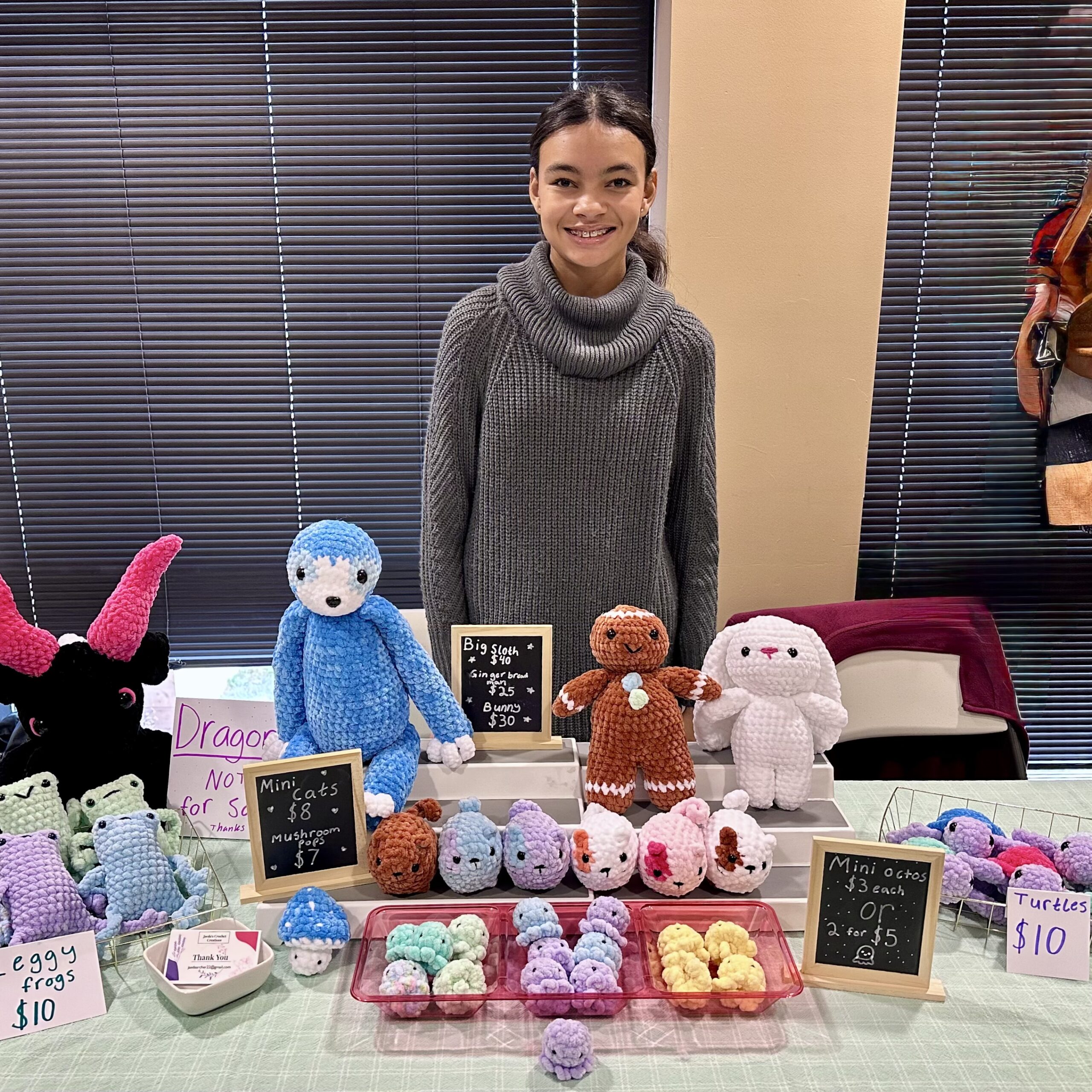Jaeda Archer is only 14 and started her own crocheting business less than a year ago. She got started like most kids learn about new things, she found videos on YouTube. She enjoyed watching the process and although learning something online is wonderful, it can be frustrating when you get stuck. This is where her Grandma Nam came into the picture to help teach her new techniques and various stitches. Jaeda’s adorable crocheted leggy frogs, mushroom pops and turtles to sloths and bunnies this is the perfect gift for all the little ones in your life who love a good snuggly friend. Starting a business as a young person teaches them hard work, dedication, people skills, and organization, and builds confidence and self-esteem. If you would like to learn more or put in an order contact her at jaedaarcher22@gmail.com. Website coming soon!