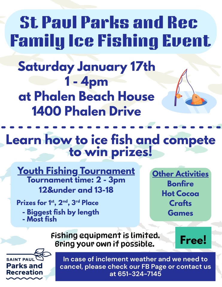 Learn how to fish and compete for prizes at the family ice fishing event at Phalen! This event is free and all are welcome. Meet at Phalen Beach for ice fishing, bonfire, hot chocolate, crafts, and games. The youth fishing tournament will be split into two categories: 12 & under...